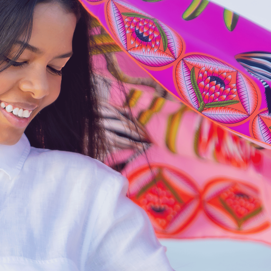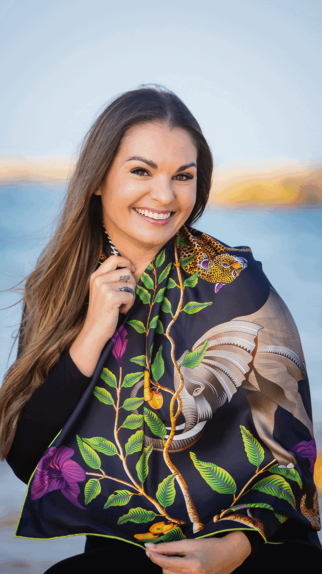 Fashioned from the finest mulberry 16mm twill silk with meticulous hand-rolled edges, this scarf promises a luxurious feel and captivating visual allure. Its double-sided design transforms it into two products in one, providing you with the ease to switch up your look and style seamlessly. Our distinguished collection of double-sided, printed Silk Scarves encapsulates elegance and versatility. Originating from South Africa, these scarves showcase a distinctive blend of craftsmanship and artistic flair, making them a unique and stylish accessory.Size 90cm x 90cm