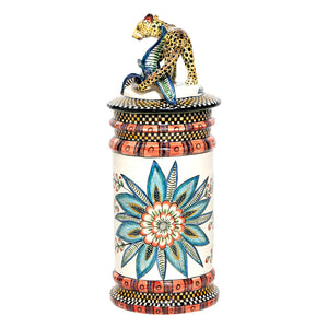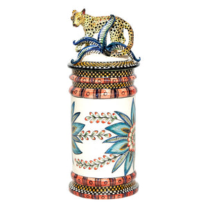 The Leopard on Blue flower cookie jar was designed by Wiseman Ndlovu in South Africa.