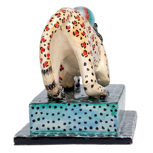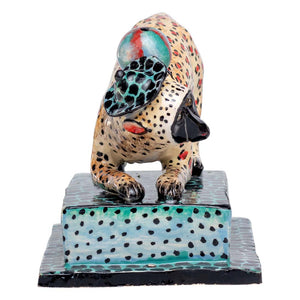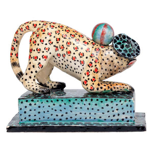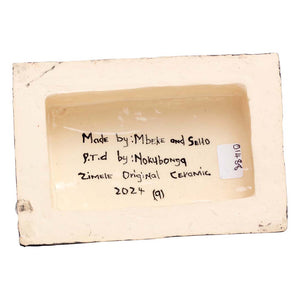 The monkey playing ball sculpture was designed by Zimele Ceramics in South Africa in 2024. This ceramic artwork was sculpted by Mbeke & Sello Mosola and painted by Nokubonga, measuring 5 inches high, 6 inches long and 4 inches wide.