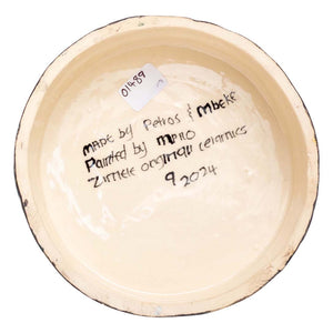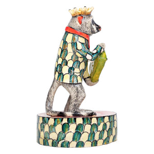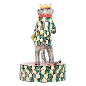 Monkey wearing black & white scotch coat holding his suit case sculpture was designed by Victor in South Africa in 2024. This product was sculpted by Petros & Mbeke, and painted by Mpilo, it measures H.9 in. L.6 in. W.5 in. This ceramic artwork will compl