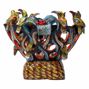 This vibrant bowl from Zimele Ceramics celebrates the sunbird, a beloved nectar-feeding species known for its iridescent plumage. Hand-sculpted and painted in KwaZulu-Natal, the bowl features two sunbirds perched among raised sculptural flowers, their long, curved beaks reaching into blossoms. With brilliant blues, greens, and reds layered across the featherwork and florals, the piece radiates warmth and movement. Both functional and decorative, this one-of-a-kind work embodies the grace and vibrancy of the South African garden.