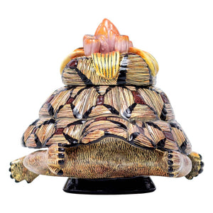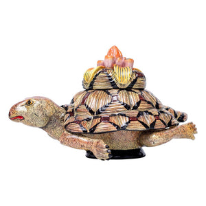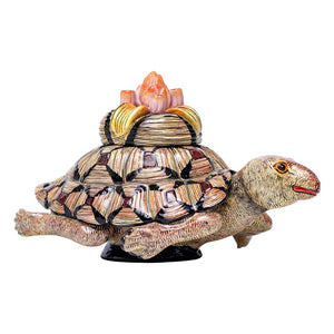 The tortoise jewelry box was made in South Africa in 2024. This ceramic artwork was sculpted by Sfiso Mvelase and painted by Jabu Nene, measuring 5 inches high, 8 inches long and 4 inches wide.