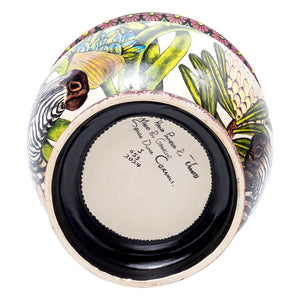 The zebra, protea flower, purple,white,green,yellow,pot plant was made in South Africa in 2024. This ceramic artwork was sculpted by George Manyathela and painted by Junoth Ncube, measuring 11 inches high, 12 inches long, and 12 inches wide.