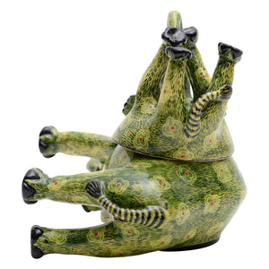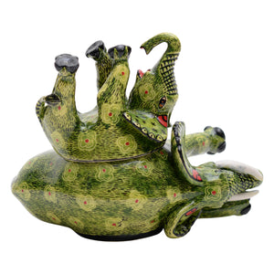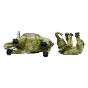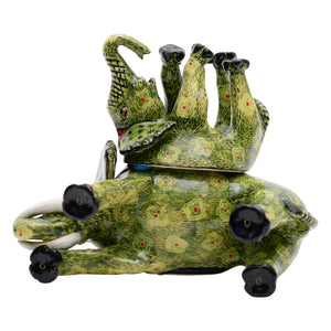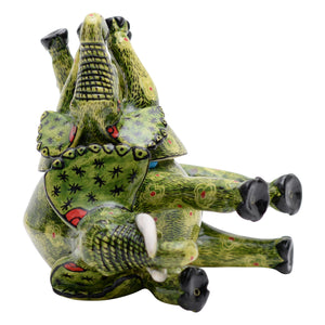 The elephant jewelry box was made in South Africa in 2024. This ceramic artwork was sculpted by Lucky Moloi and painted by Ntokozo Shabal, measuring 5 inches high, 7 inches long, and 6 inches wide.
