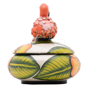 The flamingo jewelry box was made in South Africa in 2025. This ceramic artwork was sculpted by Sello mohlakoane and painted by Mpilo Cindi, measuring 6 inches in height, 4 inches in length, 4 inches in width.