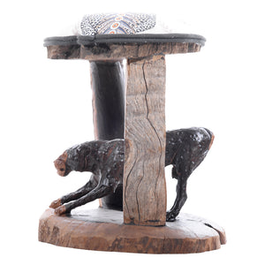 The leopard batonga stool was commissioned by Pascoe Gallery. Carved by hand in Zimbawe by skilled artisans from a single piece of iron wood, without breaking the log. It measures H.14 .in L.12 in. W.6 in.