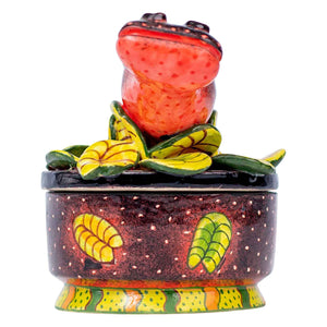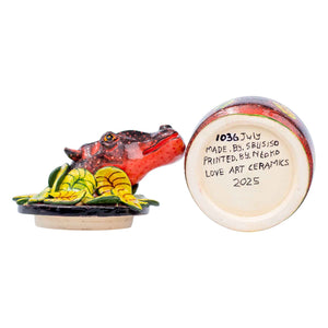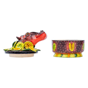 The hippo jewelry box was made in South Africa in 2025. This ceramic artwork was sculpted by Sbusiso Ndaba and painted by Ntokozo Shabalala, measuring 6 inches in height, 4 inches in length, 4 inches in width.
