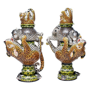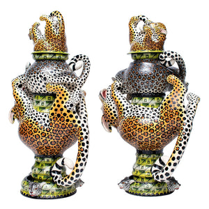 Pair of Leopard Urns The Pair of Leopard Urns is an extraordinary ceramic decorative art piece that captures the fierce beauty and elegance of South Africa's wildlife. Crafted by Love Art Ceramic in 2024, these stunning urns are sculpted by the talented Motsamai Sello and hand-painted by Nozipho Ntshalintshali. Each urn measures 24 inches high, 9 inches long, and 9 inches wide, making them striking focal points in any space. The design of the urns features intricately detailed leopards, renowned for their grace and strength. These magnificent creatures embody the spirit of the African savanna, and the artwork reflects their natural beauty through carefully sculpted features and lifelike expressions. The meticulous attention to detail highlights the unique patterns of the leopard's fur, capturing the essence of this majestic animal.