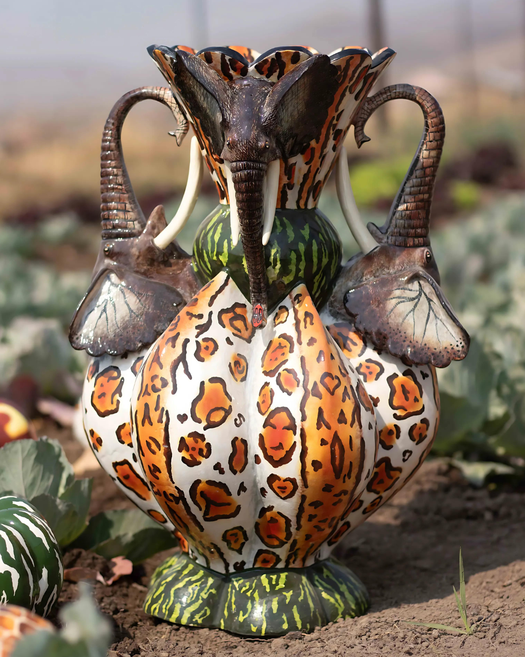 The Pumpkin Elephants Vase, the crown jewel of The Pumpkin Patch collection. Crafted by talented young artists Swelihle Khanyeza and Nozipho Ntshali Ntshali, this piece features sculpted elephant heads as handles and a striking leopard print in warm autumn tones.