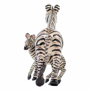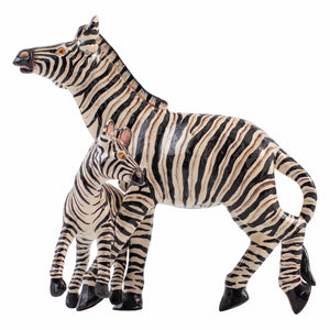 This unique Zebra Sculpture is a one-of-a-kind creation from Senzo Duma Ceramics, meticulously hand-sculpted by Phomotso Mafura and vividly hand-painted by Mlungisi Maseko in South Africa. This captivating piece beautifully depicts an adult zebra standing protectively beside its young foal, their iconic black and white stripes rendered with remarkable detail. Beyond their visual appeal, zebras hold deep cultural significance in Africa, symbolizing balance, unity, and community. Furthermore, the recovery of the Cape Mountain Zebra in South Africa from near extinction stands as a testament to successful conservation efforts. Standing approximately 11 inches high, 9 inches long, and 4 inches wide, this sculpture embodies exceptional artistry and a profound connection to the spirit of the savanna.