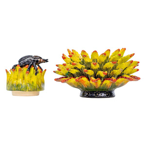 The beetle & aloe jewelry box was made in South Africa in 2025. This ceramic artwork was sculpted by Sfiso Mvelase and painted by Swelihle Khanyeza, measuring 5 inches in height, 5 inches in length, 5 inches in width.