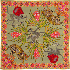 Large, Black & olive silk scarf with leopards, monkeys & protea flowers 55 in