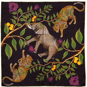Small, blue & black silk scarf with elephant, leopards & red flowers 35 in