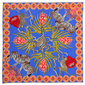 Small, Blue & light blue silk scarf with zebras, monkeys & protea flowers 35 in