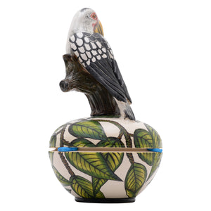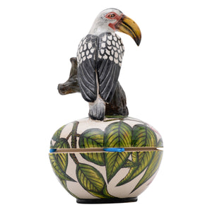 The hornbill jewelry box was made in South Africa in 2025. This ceramic artwork was sculpted by Sello mohlakoane and painted by Samkelo Gumede, measuring 7 inches in height, 4 inches in length, 4 inches in width.