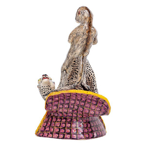 The leopard, monkey sculpture was designed by Zimele Ceramics in South Africa in 2024. This ceramic artwork was sculpted by Victor and painted by Matrina, measuring 10 inches high, 11 inches long and 7 inches wide.