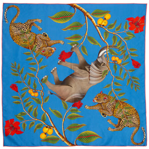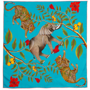 Small, Turquoise & blue silk scarf with elephant, leopards & red flowers 35 in