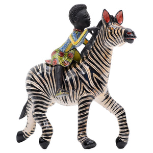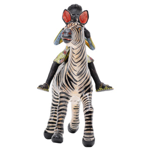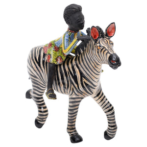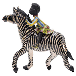 This one-of-a-kind ceramic sculpture, hand-sculpted and hand-painted in South Africa, depicts a young African figure riding a majestic zebra with grace and joy. The rider wears a vibrantly patterned dress and beaded necklace, a nod to traditional Zulu ceremonial attire that symbolizes heritage, status, and connection to nature. The zebra — an icon of the African savanna — represents harmony and individuality within community, its striking stripes celebrated in South African folklore. Each detail, from the rider’s serene expression to the zebra’s lively posture, reflects the artisanal skill and cultural storytelling unique to this work. A true celebration of Zulu artistry and the importance of wildlife in African culture, this collectible piece evokes the spirit of safari and the bonds between people and animals. Titled Queen Mantombi, the rider honors the spirit of African womanhood and the matriarchal presence in Zulu culture, blending folklore and wildlife in a celebration of heritage.
