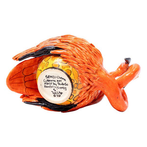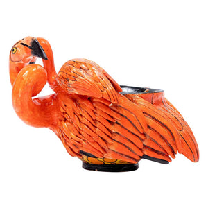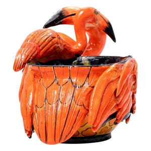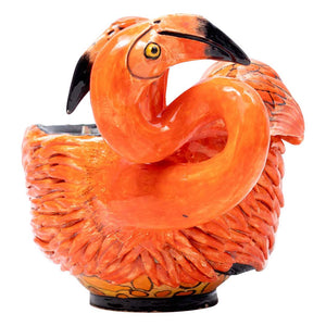 The flamingo,green leaves, peanut bowl was made in South Africa in 2024. This ceramic artwork was sculpted by Lefu Thebe and painted by Celimpilo Cindi, measuring 5 inches high, 9 inches long, and 4 inches wide.