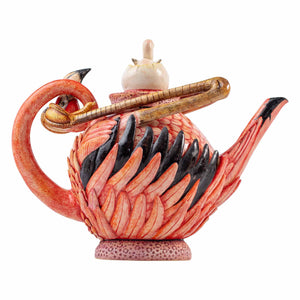 This unique Flamingo Teapot is a one-of-a-kind creation from Senzo Duma Ceramics, meticulously hand-sculpted by Phomotso Mafura and vividly hand-painted by Senzo Duma in South Africa. This whimsical decorative piece artfully embodies a flamingo, with its body forming the teapot. The surface is richly detailed with sculpted feathers in vibrant shades of pink and white, accented by striking black plumes. The teapot's handle gracefully curves to form the flamingo's elegant neck, while its long, distinctive beak serves as the spout. Crowning the lid is an adorable sculpted flamingo chick, newly hatched from its egg. Standing approximately 12 inches high, 14 inches long, and 8 inches wide, this teapot is a testament to exceptional artistry.