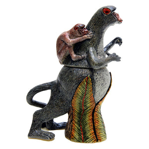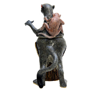 The monkey jewelry box was made in South Africa in 2023. This ceramic artwork was sculpted by Sondelani & Sabelo and painted by Sabelo Nene, measuring 8 inches high, 4 inches long and 7 inches wide.