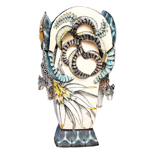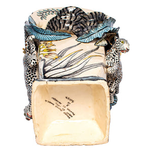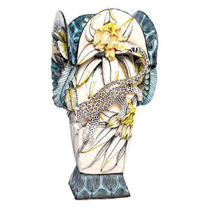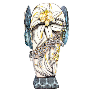 Introducing the striking Leopard Vase by Senzo Duma Ceramics, a true masterpiece of African craftsmanship, meticulously hand-painted and hand-sculpted in South Africa. Crafted with precision and passion by Senzo Duma Ceramics in 2024, this unique vase measures 20 inches high, 11 inches in length, and 11 inches wide. It boasts a distinctive rectangular shape culminating in a half-circle top adorned with sculpted floral details. Two majestic leopards grace each opposite side of the vase, their presence commanding attention. Against a backdrop of orange over white tones, the leopards blend beautifully with the surrounding foliage, while contrasting with the interior and details painted in cool blues. In African culture, leopards are revered for their strength, agility, and stealth. They are symbols of power and royalty, prominently featured in folklore and mythology, representing bravery, courage, and the spirit of the wild. This Leopard Vase not only serves as a stunning decorative piece but also as a tribute to the beauty and significance of leopards in African culture. Whether displayed as a centerpiece or accent piece, it is sure to inspire admiration and captivate the imagination with its artistic elegance and cultural symbolism.