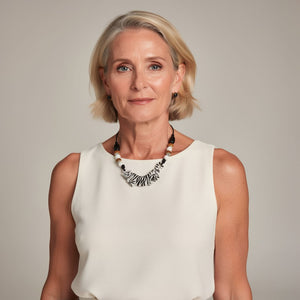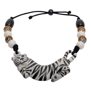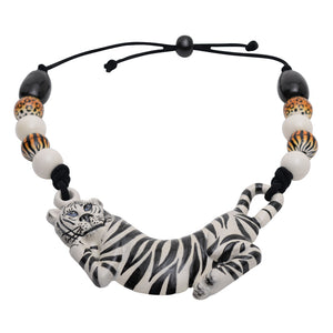 The tiger multi beads necklace was made in the United States in 2025. This artwork was made by Liz Gilbert, measuring 29 inches long.